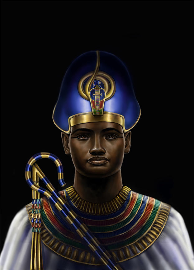 By far Ramomar's favorite genre of artwork to produce, or at least the best represented on his site's gallery, are painted and sketched portraits of royalty and gods from native Egyptian and Nubian culture. Personalities he has portrayed include the Egyptian Amenhotep III, Ramses II, Tiye, Akhenaten, and the Nubian Piye (or Pianki) and Taharqa. I admire how Ramomar's portraits so faithfully match those of authentic ancient statuary from those cultures, yet he renders them as they may have looked as flesh-and-blood people. And he certainly portraits the indigenous, pre-Islamic Egyptians' appearance much more accurately than most other artists (take notes, Ridley Scott).